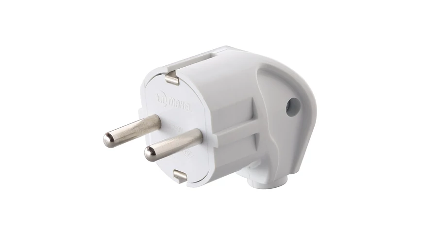 Földelt lengő dugvilla oldalsó kivezetéssel fehér műanyag.