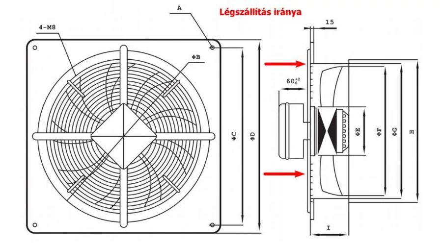 BS-FR Axiális fali ventilátor 20-63cm lapát átmérővel. Négyszögletes acéllemez keret, acél védőháló, alacsony zajszint, alacsony energiafogyasztás. Egyfázisú aszinkron motor. Porfestett acéllemez ház, acél lapátok. Standard kialakítás: -25C° + 55 C° közötti használatra. Folyamatos üzemmódra alkalmas golyós csapágyazással. Tiszta, vagy enyhén szennyezett levegő szállítására. Ipari vagy mezőgazdasági felhasználásra. 230V. IP X4