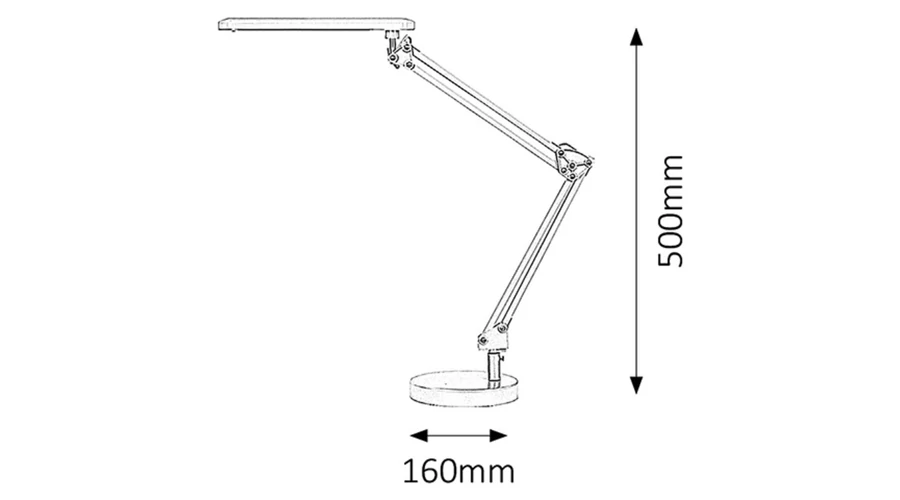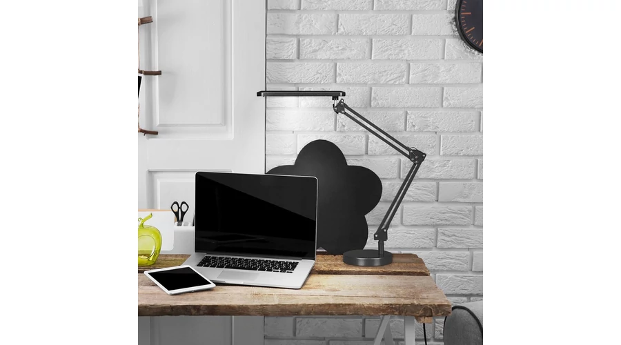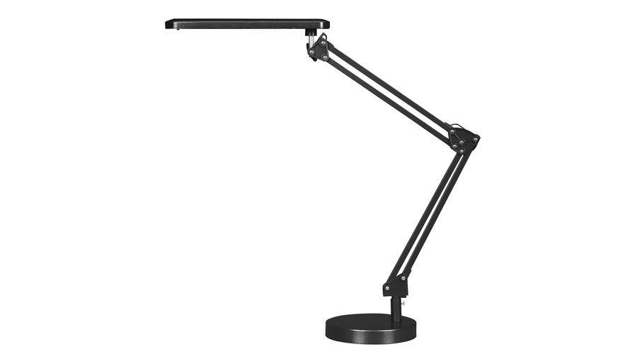 Modern megjelenésű asztali lámpa beépített energiatakarékos LED fényforrással, állítható karral és fejjel, max. 50 cm magassággal, fekete színben. Fém lámpatest és műanyag lámpabúra, tartós kivtelben. A beépített fényforrás 5,6W teljesítmény mellett 350 lumenes fényerőt és 4000 Kelvines, természetes fehér színű fényt biztosít. 5 év garanciával. A lámpatestbe beépített fényforrás nem cserélhető!