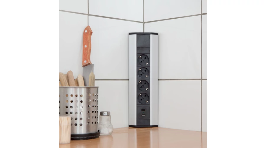 Ennek a sarokban helyezhető elosztónak köszönhetően helyet takaríthat meg bármely felületen. Ideális lehet konyhákba, szobákba, irodákba és minden olyan helyen, ahol nem lehetséges villamoshálózat, konnektor kiépítése. A beépített USB portoknak köszönhetően könnyen és gyorsan feltöltheti mobil eszközeit is. Használatával elkerülhető a falak vésése vagy a munkapult, bútorlap nagymértékű vágása. A sarokba helyezhető elosztó helyet takarít meg Önnek a falfelületen is, így példál több hely marad a konyhapult felett kések, konyhai eszközök rögzítésére, felakasztására.