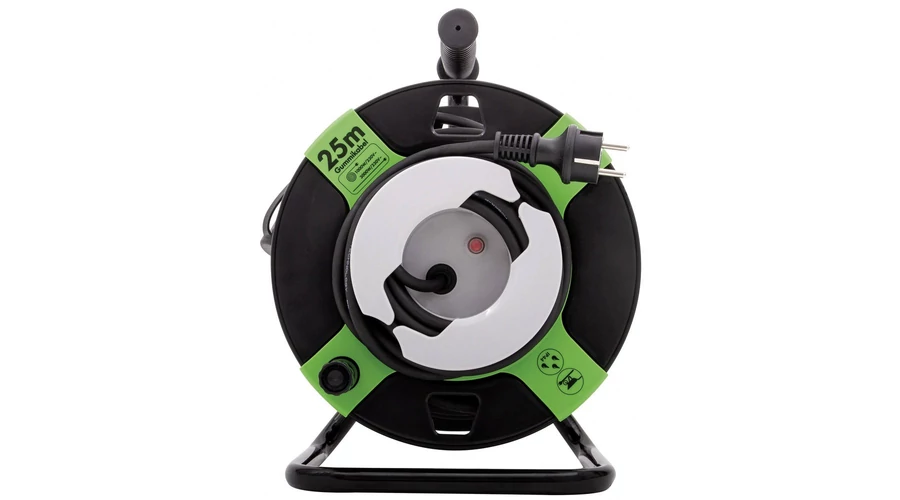 Praktikus kábelhossz (23m + 1,8m): A 23 méteres feltekercselt kábelhossz elegendő mozgásteret biztosít nagyobb kertekben is. A "+1,8m" valószínűleg a kábeldobot a fali aljzathoz csatlakoztató rövid bekötővezetéket jelöli, ami a tekercs lecsukása és mozgatása során is a helyén marad.