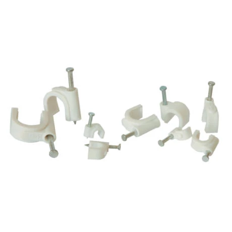 Fehér színü vezetékleszorító bilincs szeggel. 7 mm-es. Vezetékek falhoz, fához stb. rögzitéshez. 100 db/csomag
