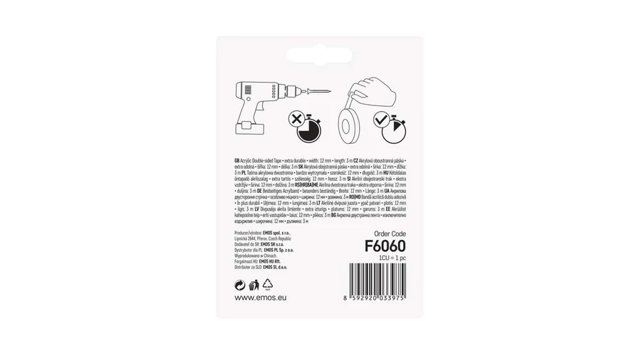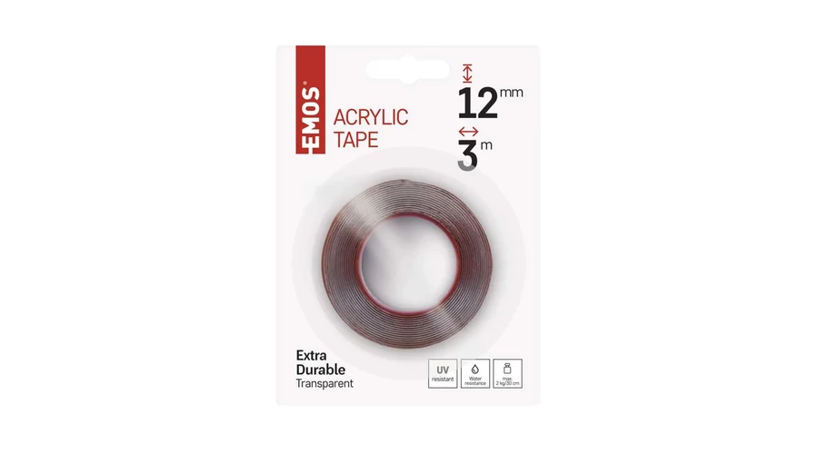 Univerzális, átlátszó, kétoldalas szalag, szélesség 12 mm és 3 méter tekercshossz, 100%-ban akrilból készült. Az rendkívüli rugalmasságának, extrém tapadásának és ellenállóságának köszönhetően tökéletesen tapad minden felületi egyenetlenséghez.