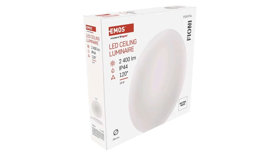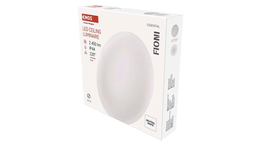 A FIONI emos LED mennyezeti lámpánál három különböző méretet, fogyasztást különböztetünk meg. A 12-1200Lm/18-1800 Lm/24W- 2400Lm fogyasztással -fényerővel rendelkezőket. A FIONI mennyezeti lámpatestek természetes fehér színben világítának. Védettségüket tekintve IP44 védettséggel rendelkeznek ( ami azt jelenti, hogy védett apró méretű szilárd tárgyak ellen (>1 mm) és védett fröccsenő víz ellen minden irányból), ezzel a nagyszerű tulajdonságával fürdőszobába is bátran mennyezetre és falra is helyezhető.