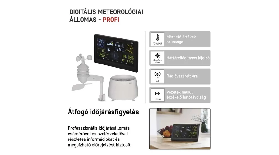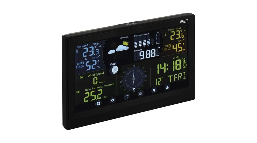 Az EMOS professzionális időjárás-állomás azonban nem csupán az aktuális időjárást mutatja, hanem nagy előnye a következő néhány óra időjárás-előrejelzése, ahogy az is, hogy rögzíti a fontosabb adatokat, például a hőmérsékleti szélső értékeket. Az időjárás-állomáson megjeleníthetőek a hőmérsékleti és relatív páratartalom trendek, további előnye pedig a hőmérsékleti figyelmeztetés funkció, amelynek köszönhetően előre felkészülhetünk a rossz időre. És ez még nem minden: az időjárás-állomás szerves része a barométer, amely áttekintést nyújt a légnyomásról.