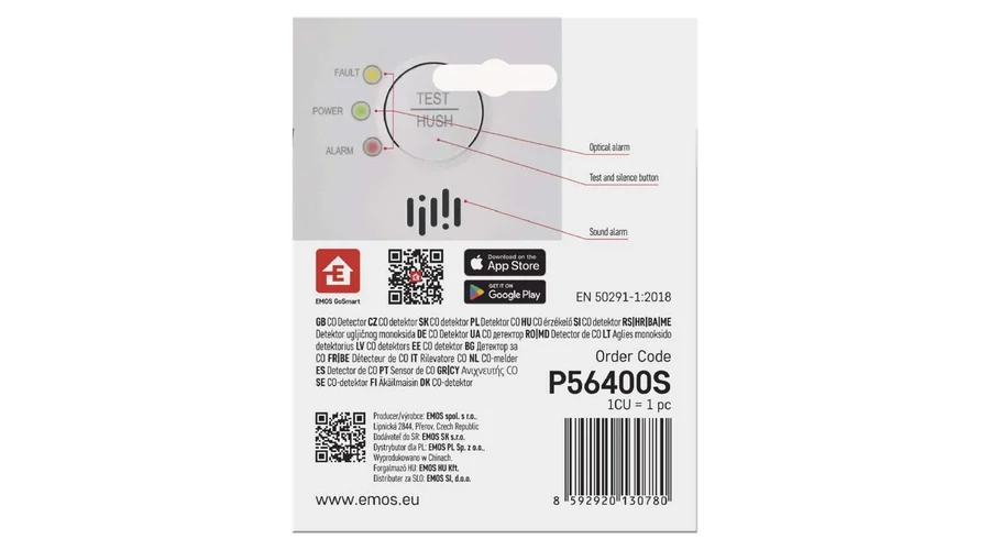 A szén-monoxid szagtalan gáz, és mérgezési kockázatot jelent mind az emberek, mind az állatok számára.A Smart CO Detector egy olyan korszerű készülék, amely megfigyeli a szén-monoxid (CO) szintjét valós időben, és korán figyelmeztet a veszélyre. Egy 85 dB-es hangjelzéssel, egy fénykibocsátó diódával és értesítéssel az EMOS GoSmart alkalmazásban a mobileszközén. Az érzékelő felakasztható vagy elhelyezhető bárhol a helyiségben, ahol fennáll a CO-szivárgás veszélye, például gázkazán vagy kályha közelében. Hálószobákba vagy nappali- és gyerekszobákba is ajánlott.