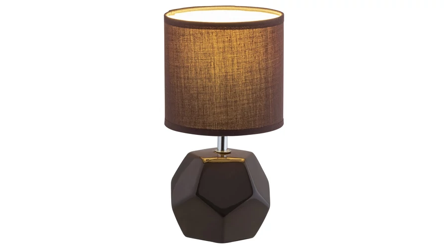 A kerámiából készült Galen asztali lámpa különlegességét a kristályra emlékeztető formára munkált modern kerámia talp adja, amelyet hagyományos stílusú, textil búra egészít ki. A Galent elhelyezhetjük a hálószobában, az éjjeliszekrényen, de ízléses kiegészítője lehet a nappali vagy a dolgozószoba berendezésének is. A meleg barna színű modell henger alakú lámpaernyője alól finoman szűrődik ki a fény, kellemes atmoszférát teremtve az adott helyiségben. A Galen asztali lámpa egy darab, legfeljebb 40 W teljesítményű fényforrással használható, a foglalat típusa E14. Ha otthonos, meghitt hangulatot szeretnénk, érdemes meleg fehér színű fényforrást választani hozzá. A vezetékes, billenő kapcsolóval szerelt asztali lámpa méretei a következők: magassága 260 mm, átmérője 140 mm. A Galen asztali lámpát fényforrás nélkül szállítjuk.