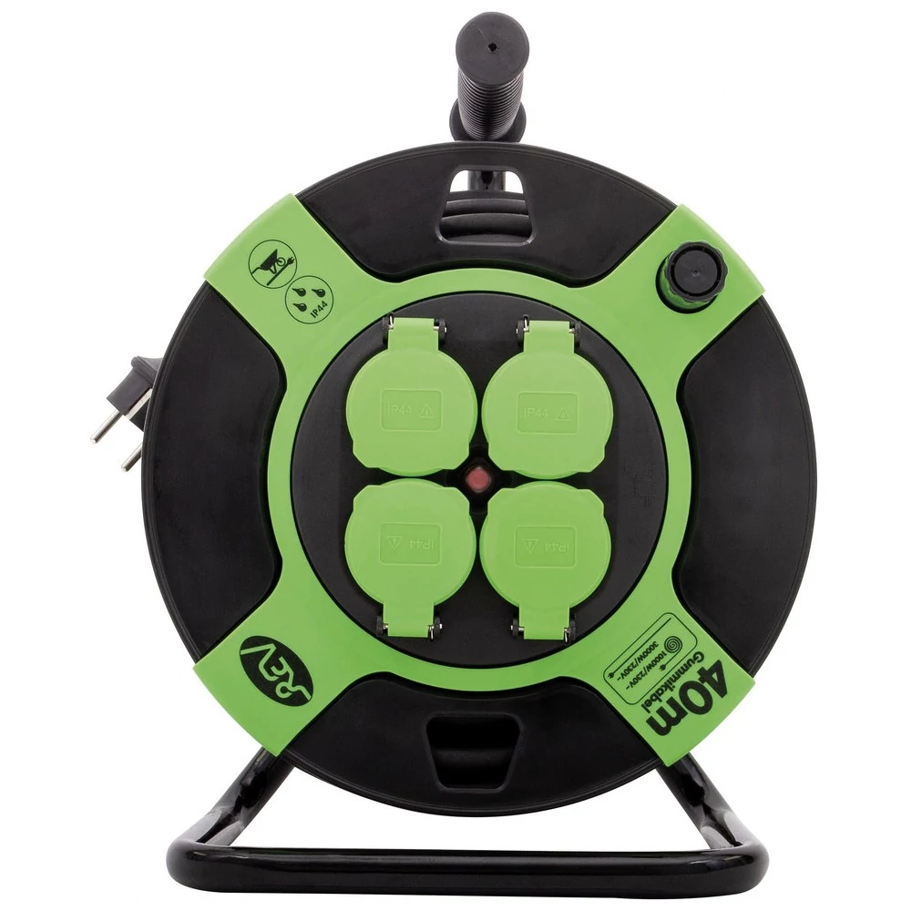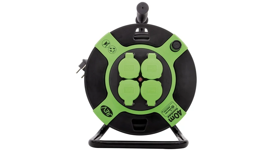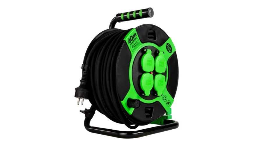 4 beépített dugalj: A kábeldobon négy földelt aljzat található, amelyek lehetővé teszik, hogy egyszerre több elektromos készüléket csatlakoztass egyetlen áramforrásra. Rendkívül kényelmes a több kerti gép (pl. fűnyíró, sövényvágó, szivattyú) vagy kültéri világítás egyidejű használatához.