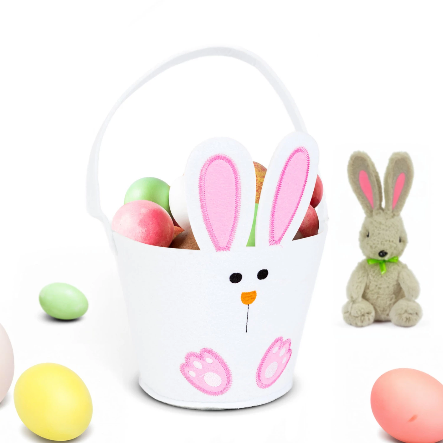 Filcből készült kosárka, vidám nyuszi mintával az oldalán. Összeállíthat édességválogatást vagy hímestojásokat tehet bele és ezzel várhatja egy-egy locsolóját. A siker garantált!