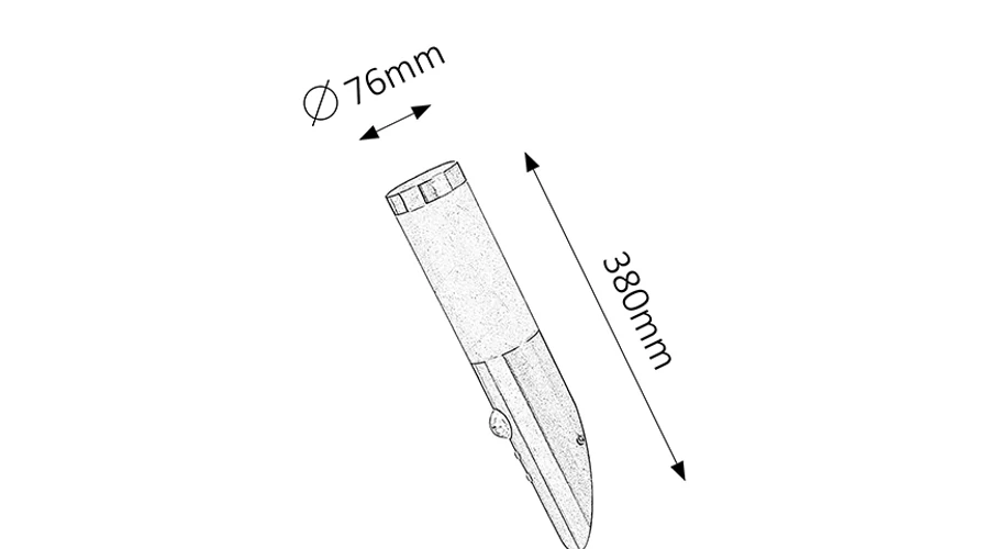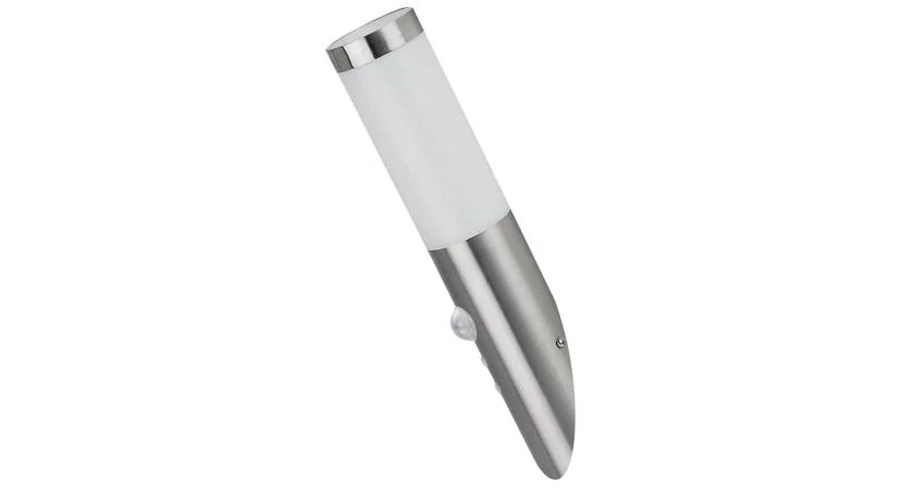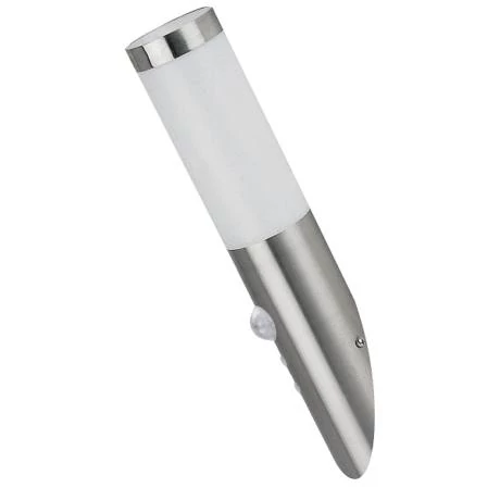 Modern megjelenésű kültéri falikar beépített mozgásérzékelővel, UV sugárzásnak ellenálló kivitelben. 38 cm magas, 7,6 cm átmérőjű, döntött talapzatú, rozsdamentes acél színű fém lámpatest és fehér színű műanyag lámpabúra, IP44-es, azaz fröccsenő víz és por elleni védelemmel. A lámpatest E27-es foglalatú, max. 25W teljesítményű energiatakarékos fényforrással is használható. A falikar elhelyezésekor vegye figyelembe, hogy a szenzor 100 fokos szögben, max. 5 méter távolságban érzékeli a mozgást.