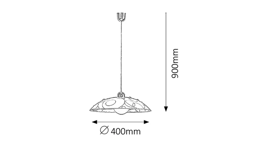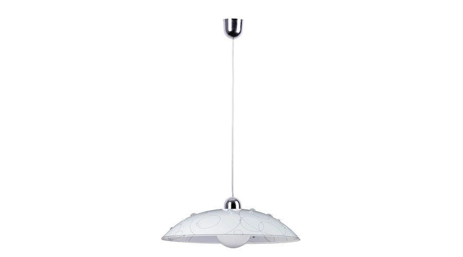 Időtlen megjelenésű függeszték, 40 cm átmérőjű, 3D hatású mintás, üveggyöngyözött üvegbúrával. Fix vezetékezés, 90 cm-es hosszúságú, fehér és króm színű. Használható valamennyi E27-es, maximum 60W teljesítményű, halogén vagy LED fényforrással. Kialakításának köszönhetően a fényforrás cseréje, illetve a lámpatest tisztítása gyorsan és egyszerűen elvégezhető.