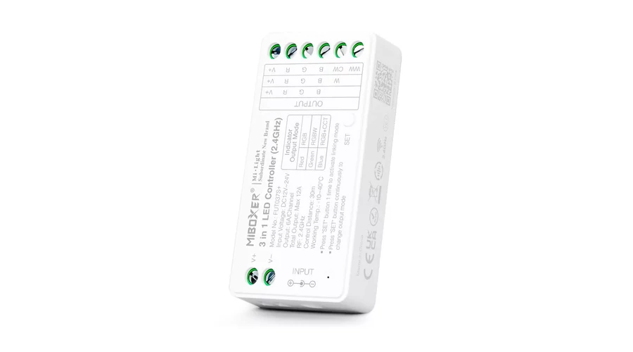 MiBoxer 3 az 1-ben RGB/RGBW/RGB+CCT LED szalag zóna vezérlő DC12-24V 12A FUT037S+