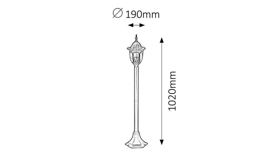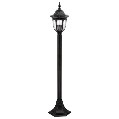 Klasszikus megjelenésű kültéri talpas lámpa 1 db foglalattal. 102 cm magas, a lámpatestnél 19 cm átmérőjű, fekete színű, fémből készített lámpatest és üvegbúra, IP43-as védettséggel. A lámpatest E27-es foglalatú, max. 60W teljesítményű fényforrással használható.