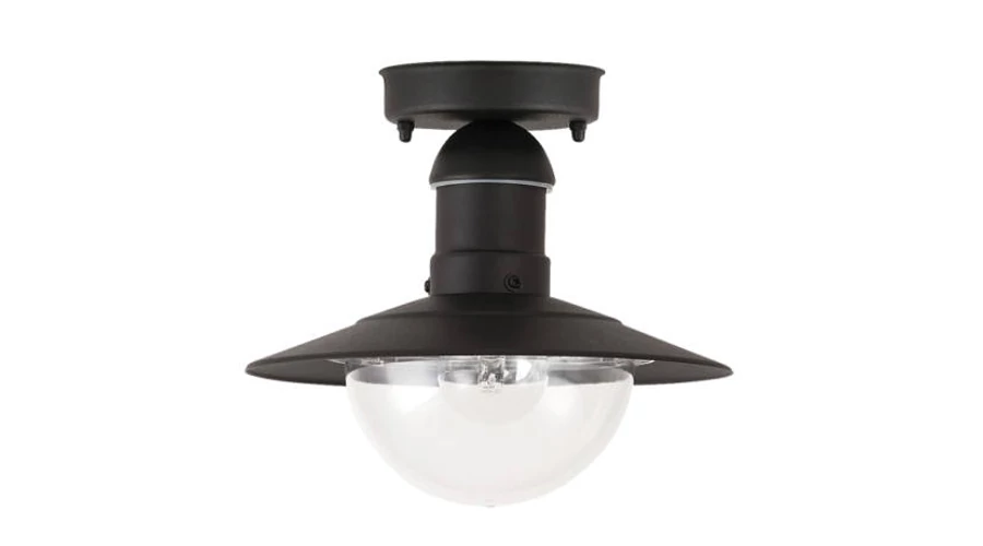 Időtlen megjelenésű kültéri mennyezeti lámpa 1 db foglalattal, UV sugárzásnak ellenálló kivitelben, IP44-es, azaz fröccsenő víz és por elleni védelemmel. 21,5 cm magas, 24 cm átmérőjű, fekete színű, fémből készített lámpatest áttetsző műanyag búrával. A lámpatest E27-es foglalatú, max. 60W teljesítményű fényforrással használható.