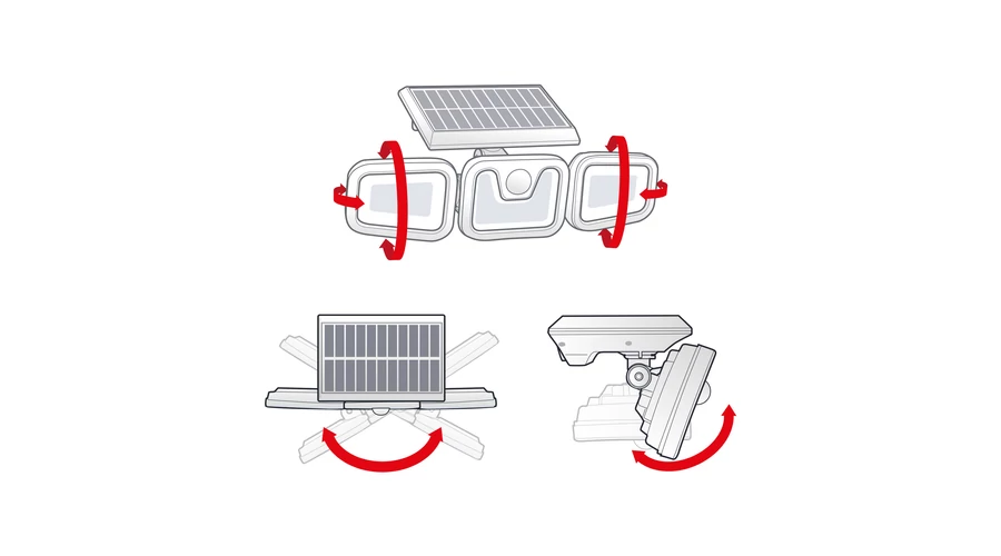 Nagy teljesítményű mozgásérzékelős fali reflektor, amely három forgatható COB LED és 1 db nagyméretű szolár egységből áll. A két tengely mentén forgatható LED-ek szabadon állíthatóak, így garantáltan minden körülmény között bevilágítják a szükséges területet. Ideális lehet teraszok, bejáratok, kocsibeállók megvilágítására. A napelemes kialakításnak köszönhetően, nincs szükség kábelezésre, villamos hálózat kiépítésére, könnyen felszerelhető a falra. Sötétben, kevés fény esetén mozgás hatására automatikusan bekapcsolja a COB LED fényforrást. A világítás ~20 mp elteltével automatikusan lekapcsol. Napközben a napelemnek köszönhetően újra feltöltődik a beépített akkumulátor.