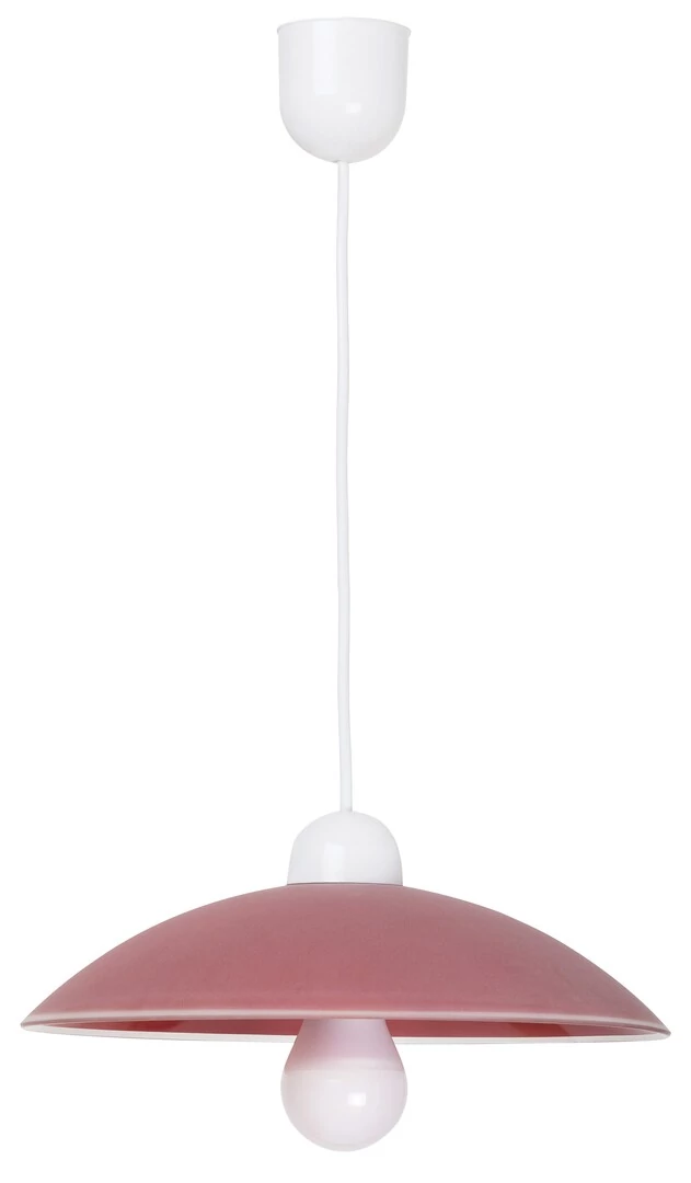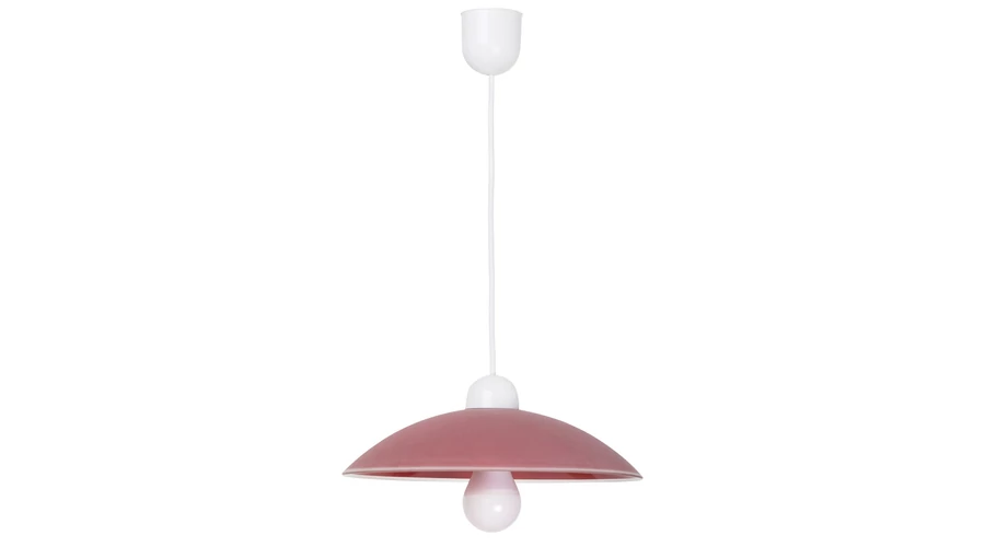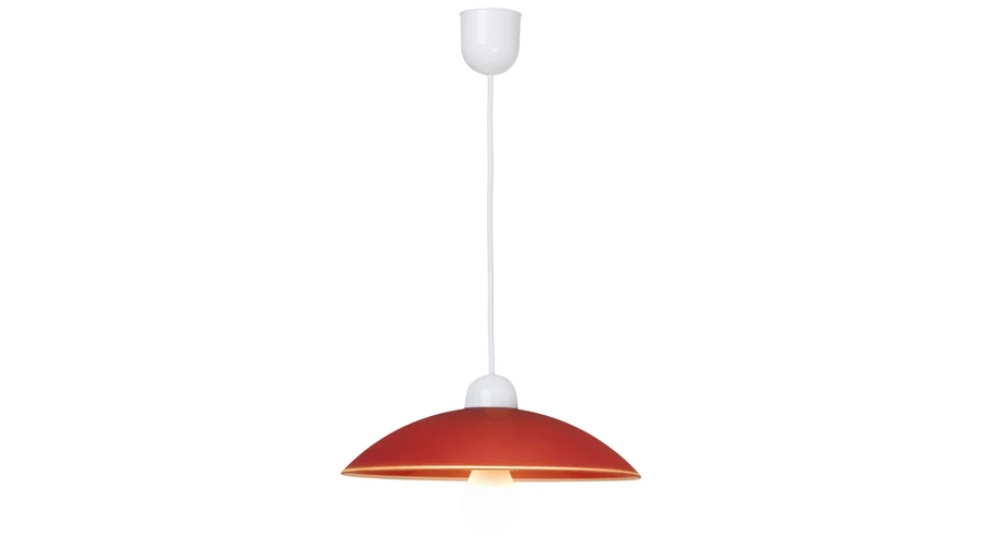 Időtlen megjelenésű függeszték fix kivitelű, 90 cm-es, fehér színű műanyag függesztékkel és 32,5 cm-es ármérőjű, íves kialakítású, bordó színű üvegbúrával. Az IP20-as védettséget adó lámpatest E27-es foglalatkialakítású, max. 60W teljesítményű fényforrással használható. 5 év garanciával!