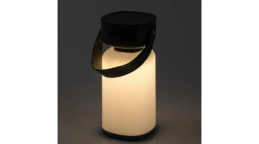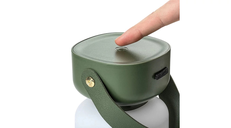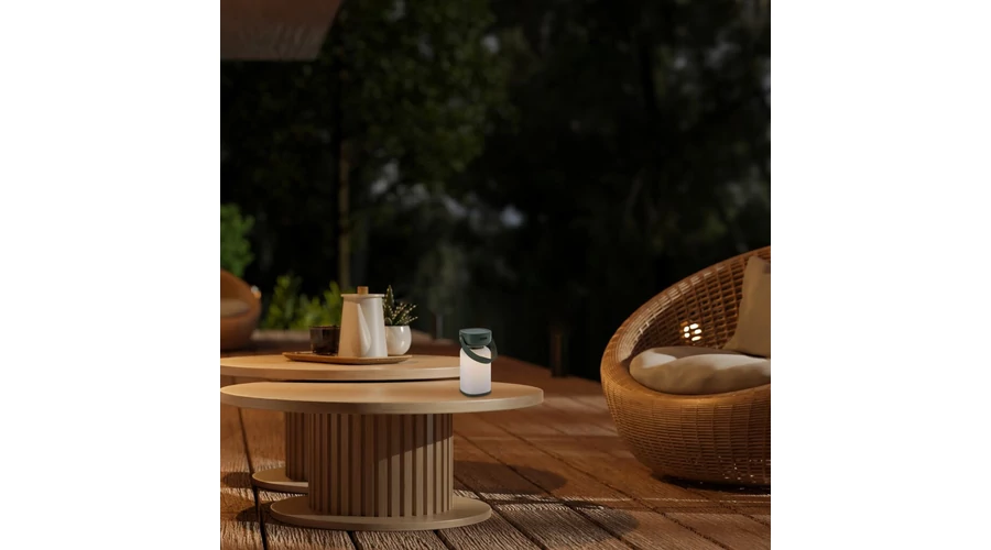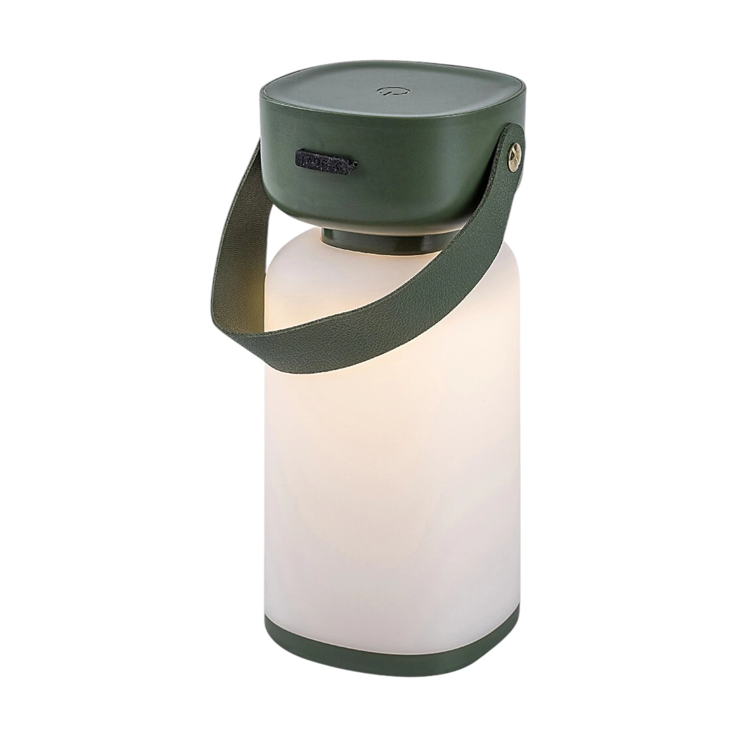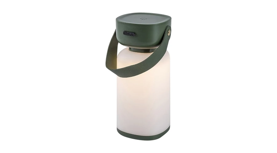 A Rábalux Funes kültéri dekor lámpa tökéletes választás a skandináv stílus és a gazdag funkcionalitással bíró design lámpák rajongóinak. A kültéri asztali lámpa teljes egészében műanyagból, zöld színben, fehér búrával készül. A palack formára emlékeztető lámpatesthez bőrszerű fülecske kapcsolódik, amelynek segítségével a lámpa egyszerűen mozgatható. A lámpásként világító design lámpa IP védett, így biztonsággal használható a teraszon vagy a kertben. Beépített LED fényforrással rendelkezik, amelynek fényereje és színhőmérséklete érintőkapcsoló segítségével változtatható. Beépített akkumulátorral szerelték fel, amely USB-C típusú kábelen keresztül 3 óra alatt tölthető fel, és egy feltöltéssel 10 órán át üzemel. A LED technológia révén ezt a modellt hosszú élettartam jellemzi.