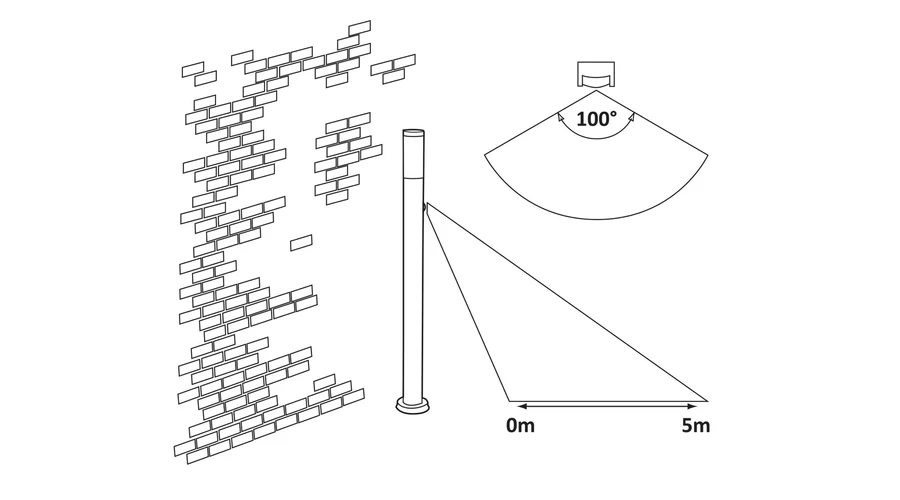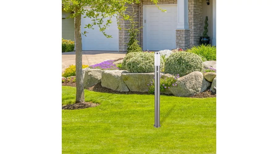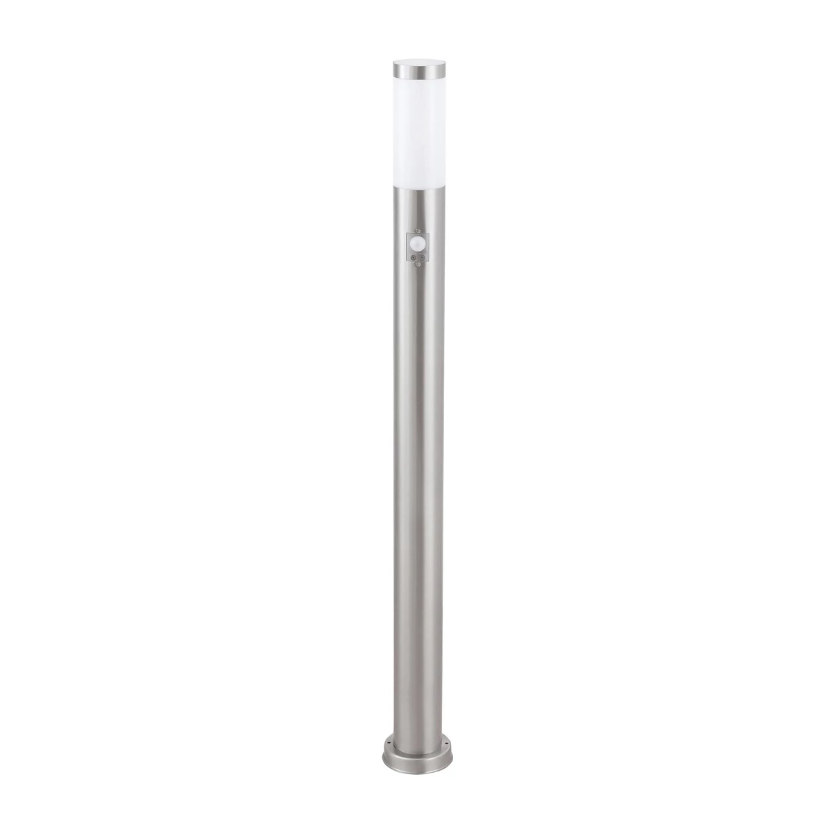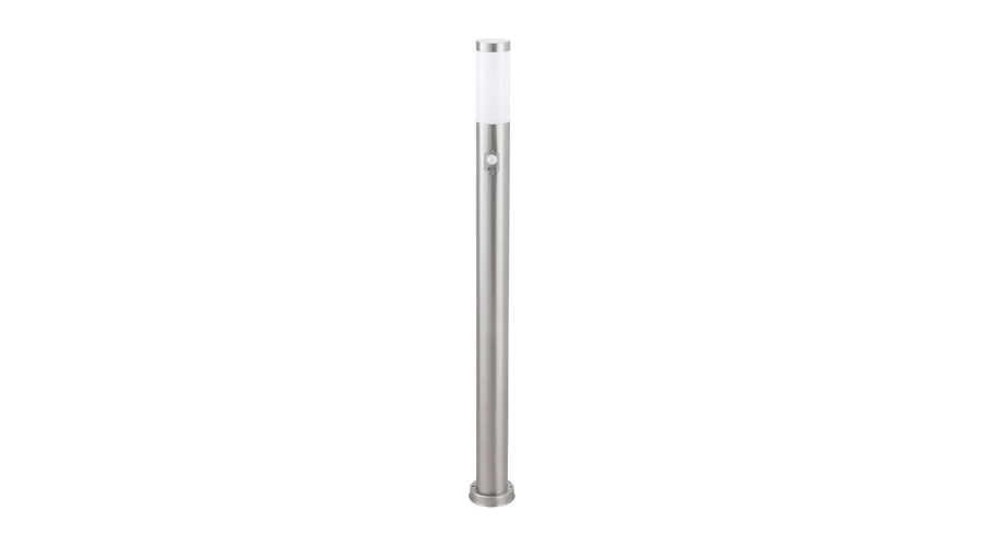 Modern megjelenésű kültéri állólámpa beépített mozgásérzékelővel, UV sugárzásnak ellenálló kivitelben. 110 cm magas, 11 cm átmérőjű, rozsdamentes acél színű fém lámpatest és fehér színű műanyag lámpabúra, IP44-es, azaz fröccsenő víz és por elleni védelemmel. A lámpatest E27-es foglalatú, max. 25W teljesítményű energiatakarékos fényforrással is használható. Az állólámpa elhelyezésekor vegye figyelembe, hogy a szenzor 100 fokos szögben, max. 5 méter távolságban érzékeli a mozgást.