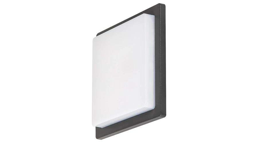 A modern stílusú Ontario kültéri fali lámpa antracitszürke színben, alumíniumból készül és fehér műanyagbúra egészíti ki. Felszerelhetjük a teraszon vagy bárhol a ház külső falán, ahol világításra van szükségünk. Egyszerű, letisztult dizájnjának köszönhetően szinte belesimul a fal síkjába. Az Ontario beépített LED fényforrással rendelkezik, amelynek a teljesítménye 8 W, fényereje 730 lumen, élettartama pedig 20 000 óra. A 4000 K színhőmérsékletű fényforrás természetes fehér fénnyel világít. A szögletes kültéri lámpa mérete 180x180 mm, faltól mért távolsága pedig mindössze 50 mm. Kevésbé esővédett helyen is bátran felszerelhetjük, mivel IP65-ös védettséggel rendelkezik, azaz teljesen zárt és védett a szilárd anyagok és szennyeződések ellen, valamint kisnyomású vízsugár ellen védett. Az Ontario kültéri fali lámpára 5 év garanciát vállalunk.