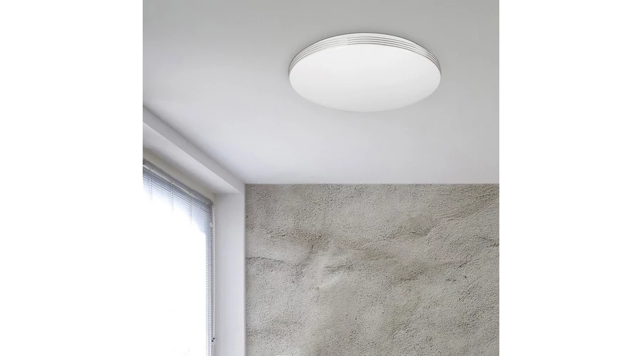 A minimál stílusú, fémből és műanyagból készült kerek Oscar 2 mennyezeti lámpát felszerelhetjük a nappaliban vagy a hálószobában. Fehér színével és egyszerű dizájnjával ez a modell jól beilleszthető szinte bármely modern otthon berendezésébe. A kerek lámpa búráján keskeny ezüstszínű sávok futnak körbe, melyek hűvös, elegáns vonásokat kölcsönöznek a lámpának. Az Oscar 2-t különösen azok figyelmébe ajánljuk, akik hosszú élettartammal bíró mennyezeti lámpát keresnek, hiszen ez a modell nem kevesebb, mint 50 000 órán keresztül szolgálja ki használóit természetes fehér fényével. A lámpa a G energiaosztályba tartozó beépített LED fényforrással rendelkezik, amelynek a teljesítménye 18 W, a lámpa fényereje búrával 1350 lumen, búra nélkül 1800 lumen. A 4000 K-es színhőmérsékletnek köszönhetően ez a mennyezeti lámpa ideális választás otthonunk egyik nagy forgalmú helyiségébe, a nappaliba. Az Oscar 2 átmérője 340 mm, mennyezettől mért távolsága 80 mm.