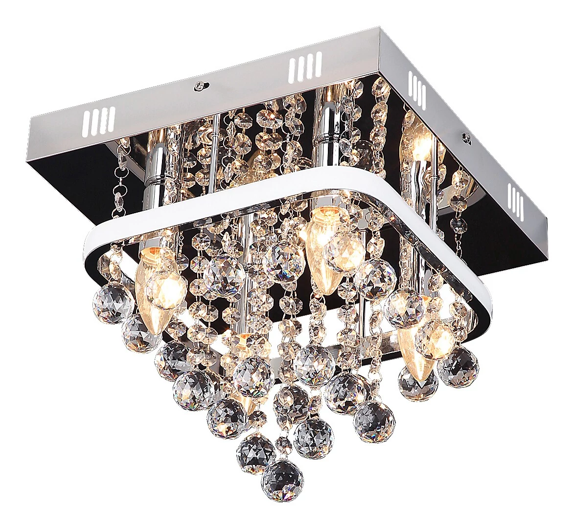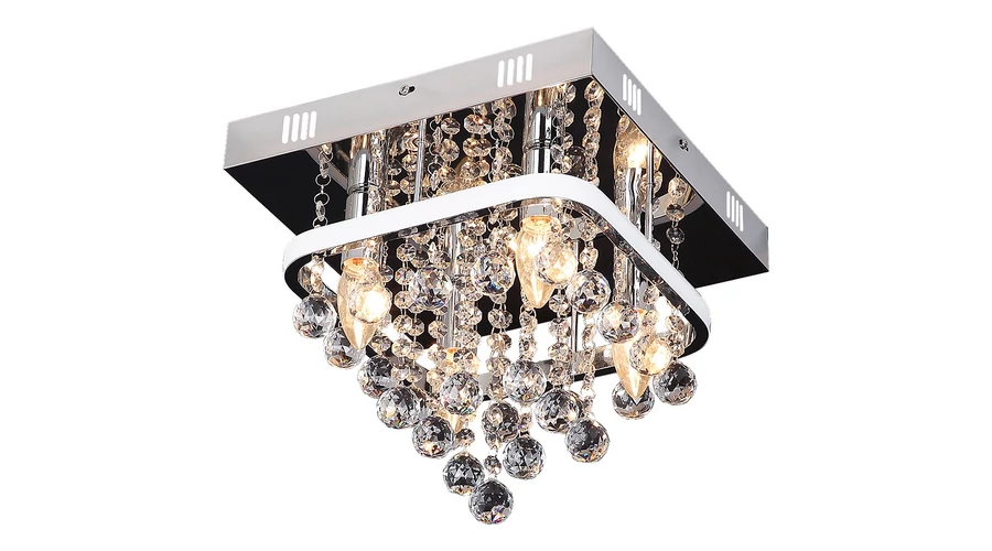 A klasszikus stílusban készült, szögletes Pallas mennyezeti lámpa látványos kiegészítője lehet nappalink, étkezőnk vagy hálószobánk berendezésének. A krómszínű, fém lámpatestet fehér akrilbúra egészíti ki, de a csillár dizájnját elsősorban a gyönyörű kristálydekorelemek határozzák meg. A Pallas beépített LED fényforrással rendelkezik, amelynek a teljesítménye 23 W, fényereje 1470 lumen, élettartama pedig 20 000 óra. A 4000 K színhőmérsékletű fényforrás természetes fehér fényt sugároz. A mennyezeti lámpa ezenfelül négy darab, egyenként legfeljebb 40 W teljesítményű fényforrásnak is helyet biztosít, a foglalatok típusa E14. A cserélhető fényforrások fényereje fali kapcsoló segítségével három lépésben szabályozható. Bárhol is helyezzük el, ez a gyönyörű és elegáns mennyezeti lámpa garantáltan hangulatos megvilágítást biztosít a szobában. A Pallas mérete 300x300 mm, mennyezettől mért távolsága 285 mm. Erre a modellre 5 év garanciát biztosítunk.