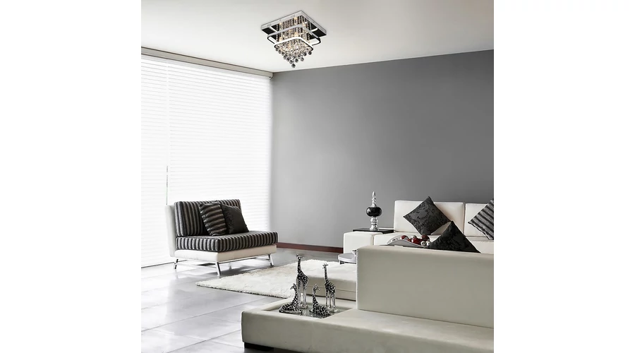 A klasszikus stílusban készült, szögletes Pallas mennyezeti lámpa látványos kiegészítője lehet nappalink, étkezőnk vagy hálószobánk berendezésének. A krómszínű, fém lámpatestet fehér akrilbúra egészíti ki, de a csillár dizájnját elsősorban a hosszan lecsüngő, gyönyörű kristálydekorelemek határozzák meg. A Pallas beépített LED fényforrással rendelkezik, amelynek a teljesítménye 36 W, fényereje 2430 lumen, élettartama pedig 20 000 óra. A 4000 K színhőmérsékletű fényforrás természetes fehér fényt sugároz. A mennyezeti lámpa ezenfelül négy darab, egyenként legfeljebb 40 W teljesítményű fényforrásnak is helyet biztosít, a foglalatok típusa E14. A cserélhető fényforrások fényereje fali kapcsoló segítségével három lépésben szabályozható. Bárhol is helyezzük el, ez a gyönyörű és elegáns mennyezeti lámpa garantáltan hangulatos megvilágítást biztosít a szobában. A Pallas mérete 400x400 mm, mennyezettől mért távolsága 365 mm. Erre a modellre 5 év garanciát biztosítunk.
