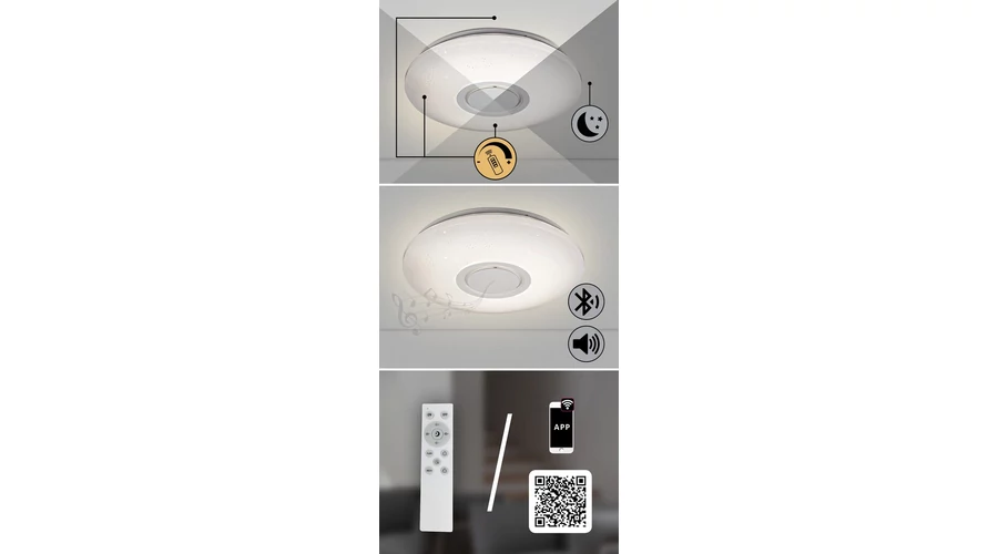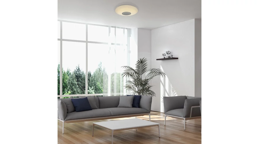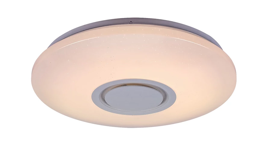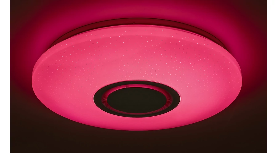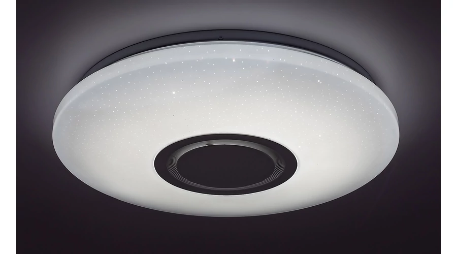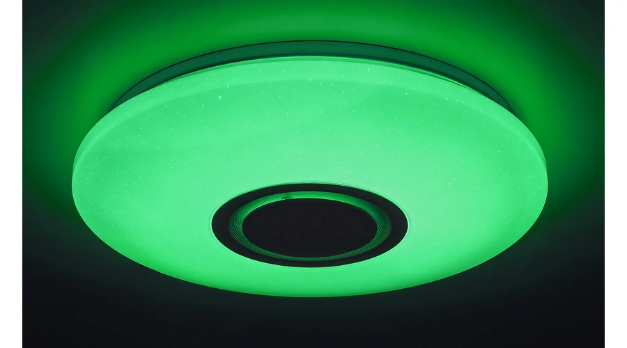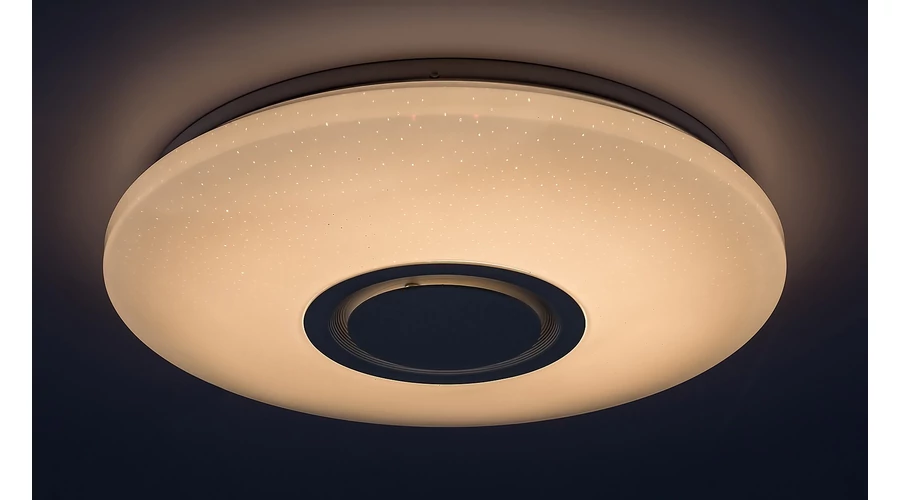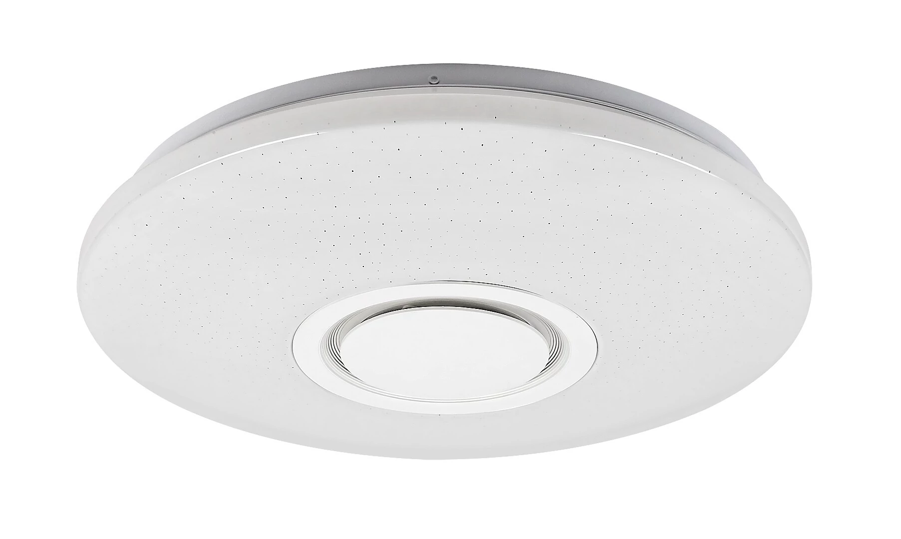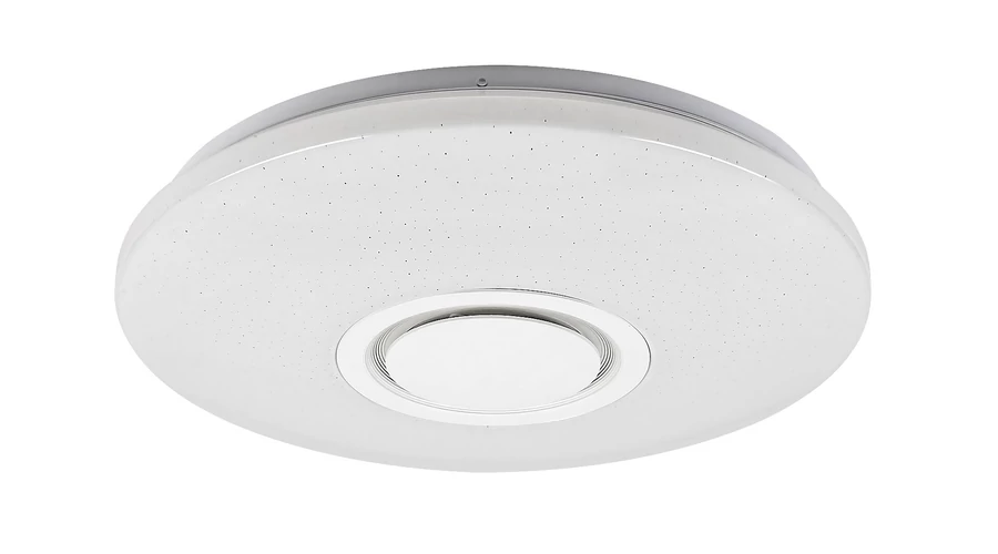 A fémből és akrilból készült Rodion WIFI-s mennyezeti lámpát számos extra funkciójának köszönhetően a család minden tagja imádni fogja. A csillogó effektes nagyméretű, kerek lámpát elsősorban a nappaliba vagy a hálószobába ajánljuk. A beépített LED fényforrás energiafogyasztása 24 W, fényereje 1800 lumen, élettartama 30 000 óra. Az okos lámpa színhőmérséklete 2700-6500 K között tetszés szerint változtatható, azaz képes meleg, természetes vagy éppen hideg fehér fénnyel megvilágítani az adott helyiséget. Ezenkívül RGB hangulatvilágítás is beállítható. De itt még nincs vége az extráknak: a Rodion távirányító segítségével dimmelhető, azaz fényereje változtatható, beleértve az éjszakai funkciót is. Az időzítő funkcióval, valamint Bluetooth hangszóróval felszerelt mennyezeti lámpa Wi-Fi kapcsolattal vezérelhető. A 400 mm átmérőjű fehér lámpa mennyezettől való távolsága 90 mm.