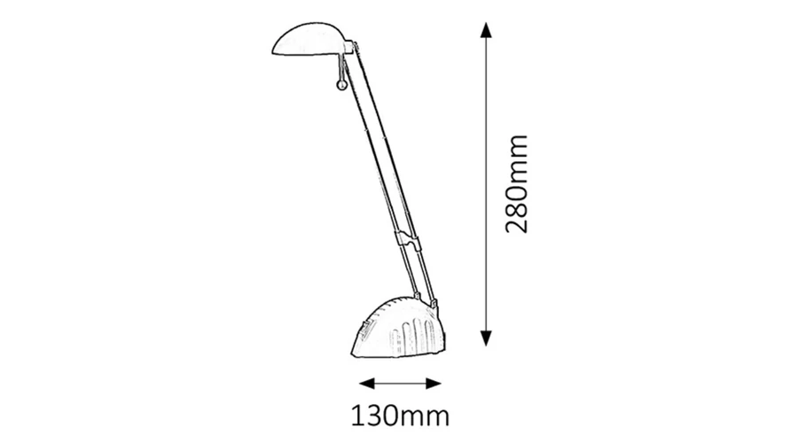 Modern megjelenésű asztali lámpa beépített energiatakarékos LED fényforrással. 13 cm széles, max. 28 cm magas, ezüst színű műanyag lámpatest és állítható magasságú lámpabúra. A beépített LED fényforrás 5W teljesítmény mellett 350 lumenes fényerőt és 4000 Kelvines, hidegfehér színű fényt biztosít. 5 év garanciával. A lámpatestbe beépített fényforrás nem cserélhető.