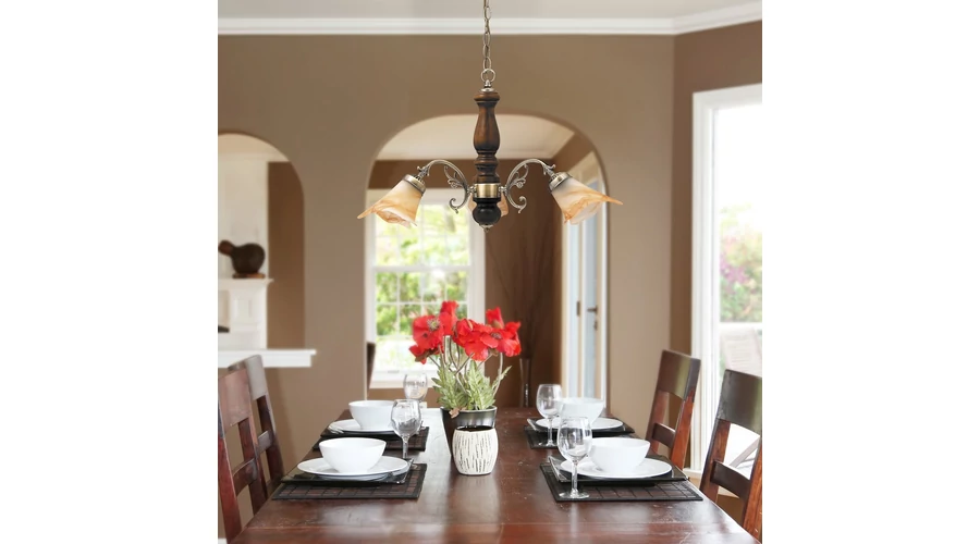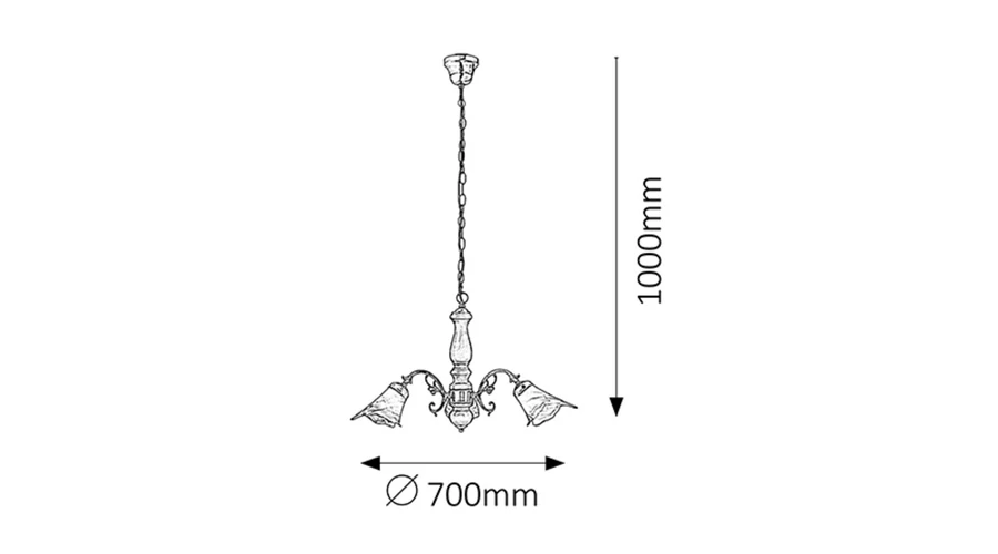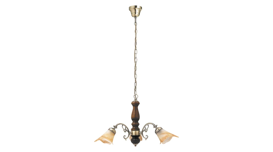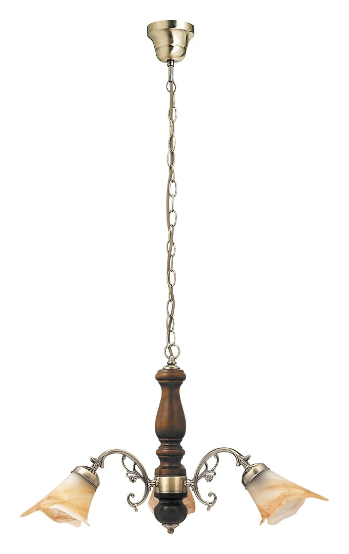 Rusztikus megjelenésű csillár 3 db foglalattal. 100 cm lelógású, 70 cm átmérőjű, bronz színű fémből és dió színű fából készített lámpatest barna mintás opálüveg lámpabúrákkal, IP20-as védelemmel. A lámpatest E14-es foglalatú, max. 3x 40W teljesítményű, akár energiatakarékos fényforrásokkal is üzemeltethető.