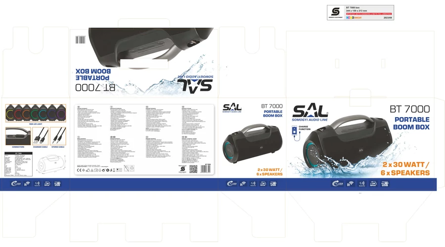 SAL BT 7000 hordozható bluetooth kihangosító, BoomBox 2x30W BT TWS 3.5mm AUX USB EQ LED effektek telefontöltés USB-C és AUX kábel vízálló