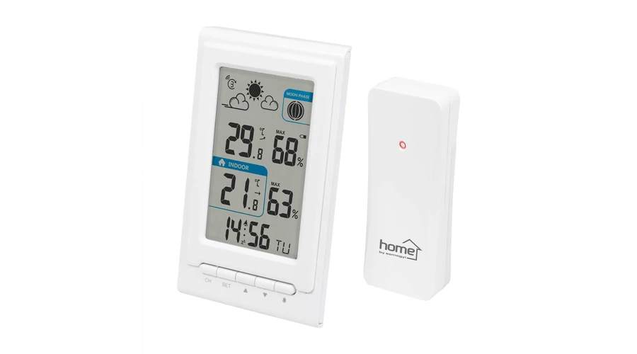 HCW 01 Időjárás állomás 1 db külső jeladóval ellátott, melyet további 2 db HCKK 10 külső jeladóval lehet még tovább bővíteni. A külső jeladó a külső hőmérsékletért és páratartalomért felelős, melyet maximum 60 m hatótávolságban (nyílt terepen) célszerű elhelyezni a belső egységtől.A várható időjárást szimbólumokkal jelzi, valamint méri a külső/ belső hőmérsékletet és páratartalmat.Az időjárás állomás a pontos időt is mutatja, valamint ébresztő funkció is beállítható rajta, így nem szükséges a szobába másik óra.Ha pontos adatokat szeretne tudni a várható és jelenlegi időjárásról, páratartalomról és holdfázisról, akkor a HCW 01 Időjárás- állomás lesz a legjobb választás.