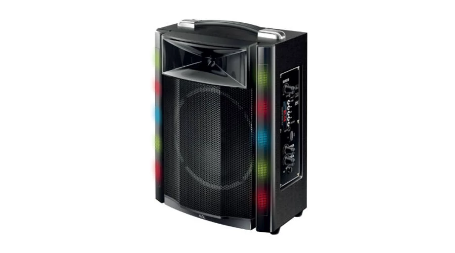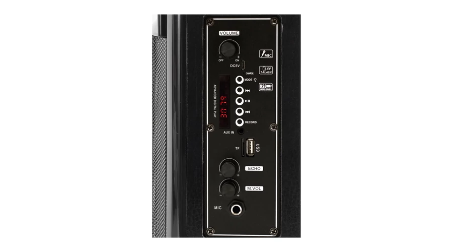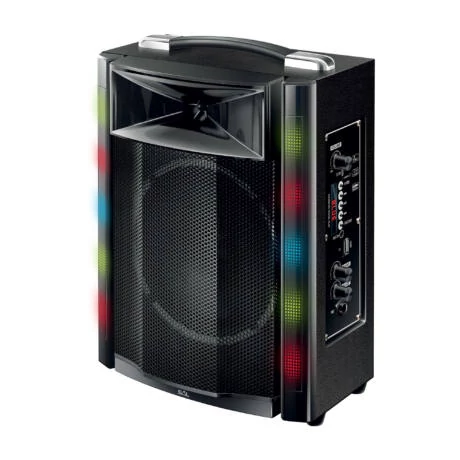 • látványos, külön kapcsolható LED fényeffekt • 2-utas: mélysugárzó + magassugárzó • vezeték nélküli BT kapcsolat • Zenehallgatás mobilkészülékről, számítógépről • MP3 lejátszás USB/microSD eszközről • WAV felvétel USB/microSD eszközre (MIC) • FM rádió automatikus állomáskereséssel • EQ hangszínbeállítás, több lejátszási mód • KARAOKE mikrofon bemenet (opció, 6,3 mm) • szabályozható mikrofonvisszhang-effekt • vezetékes audio bemenet (3,5 mm) • hangbemondás üzemmód váltáskor • beépített, nagykapacitású akkumulátor • várható működési idő: ~13 h • távirányító tápellátása: 1 x 3 V (CR2025) gombelem, tartozék • tartozék: microUSB-USB töltőkábel (0,45 m), 3.5-3.5 mm audio kábel (0,45 m) • méret: 240 x 310 x 140 mm / 1,9 kg |