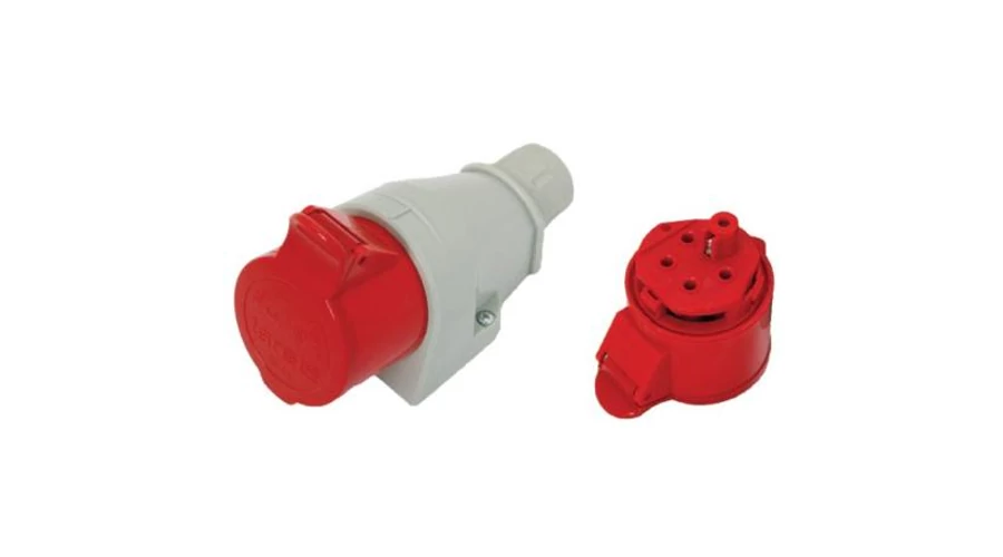 Három fázisú ipari dugalj. 16A 4 pólus. IP44 védettség. Piros-szürke. Rögzithető, csapfedeles.