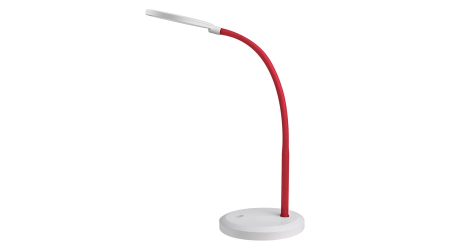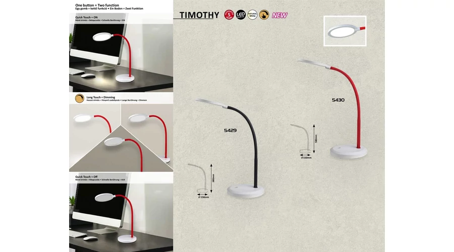 A Timothy LED asztali lámpa egyszerű, letisztult megjelenéssel rendelkezik. A szimmetrikus formavilág a fehér búra és talp megegyező formájában teljesedik ki. Az érintőkapcsolós fényerőszabályozásnak köszönhetően igényünknek megfelelően állíthatjuk a lámpa fényerejét, ennek köszönhetően csökkenthetjük a szem fáradtságát. A Timothy piros szárának beállításával óvni tudjuk szemünket és kellemes világítási élményt érhetünk el. Az aztali lámpa 4000 K-es színhőmérsékletének megfelelően természetes fehér fénnyel világít, ezáltal hosszabb ideig tudunk koncentrálni a tanulásra, olvasásra, munkára. A beépített fényforrás 7,5 W-os és 440 lumen fényerejű. A lámpa magasság 580mm, szélessége 150 mm, műanyag és fém kombinációban készült. A Timothy termékcsaládra 5 év garanciát vállalunk.