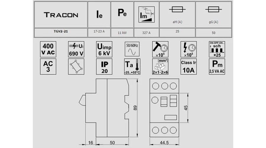 Tracon Kézi működtetésű motorvédő kapcsoló 17-23A 11kW TGV2-21