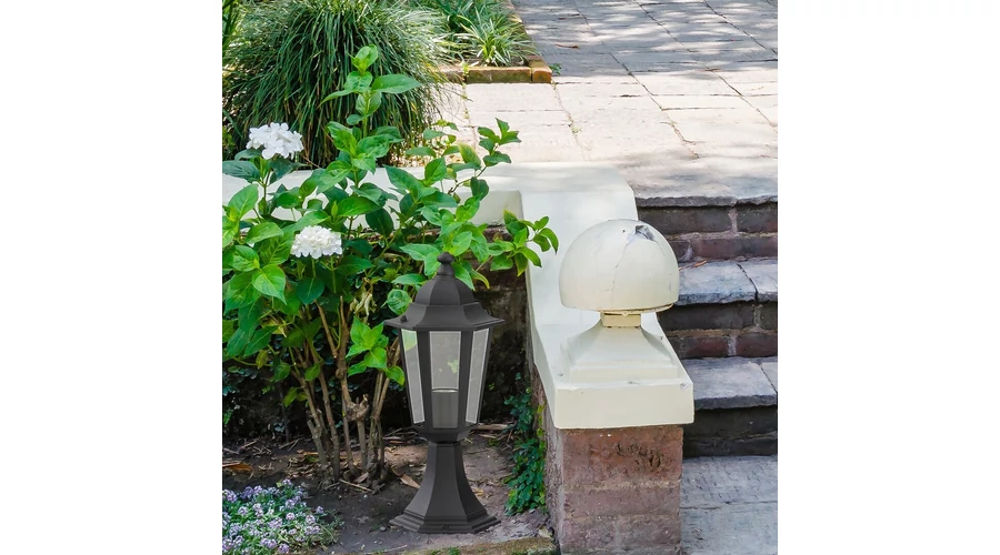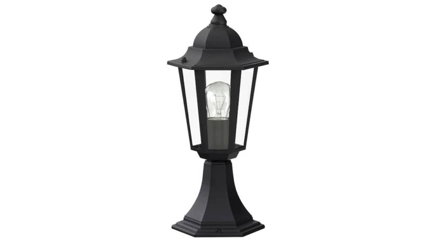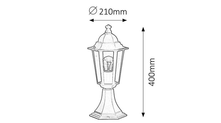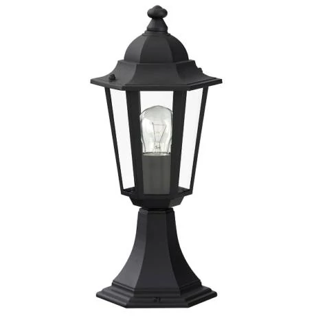 Klasszikus megjelenésű kültéri állólámpa 1 db foglalattal. 40 cm magas, 21 cm átmérőjű, fekete színű fém lámpatest és víztiszta üvegbetétes lámpabúra, IP43-as védettséggel. A lámpatest E-27-es foglalatú, max. 60W teljesítményű energiatakarékos fényforrással is használható.